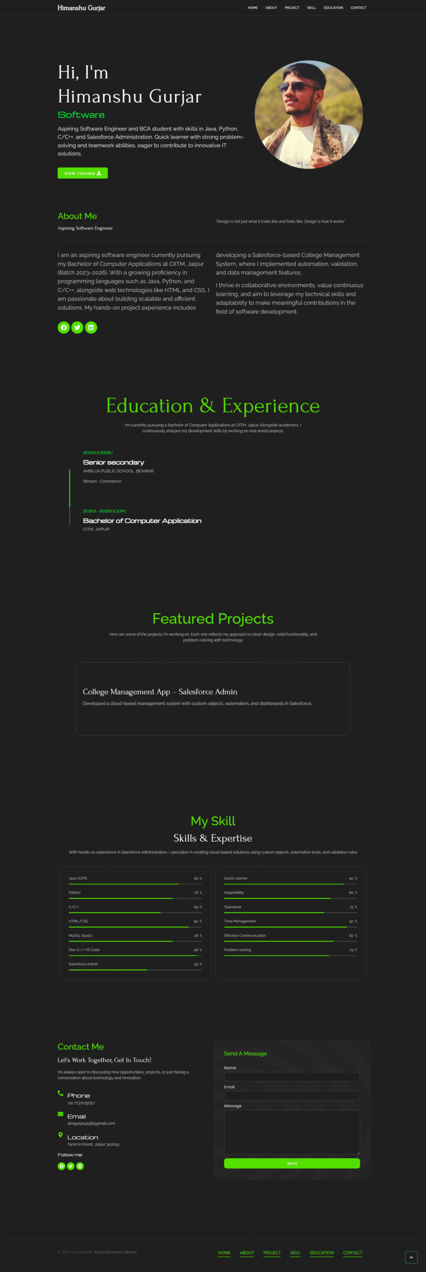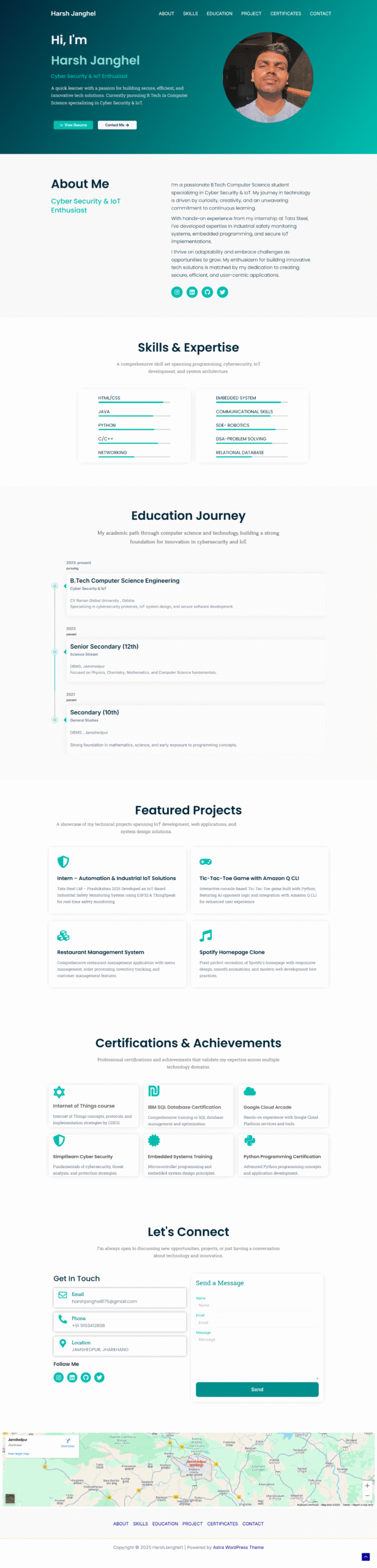 I really like how my portfolio has been made. It looks clean, simple, and very well-structured. All the sections like skills, projects, and education are clearly shown, and it perfectly highlights my work and interests. I feel proud of how it represents me and the efforts I have put in so far. Thanks for making it so nicely.